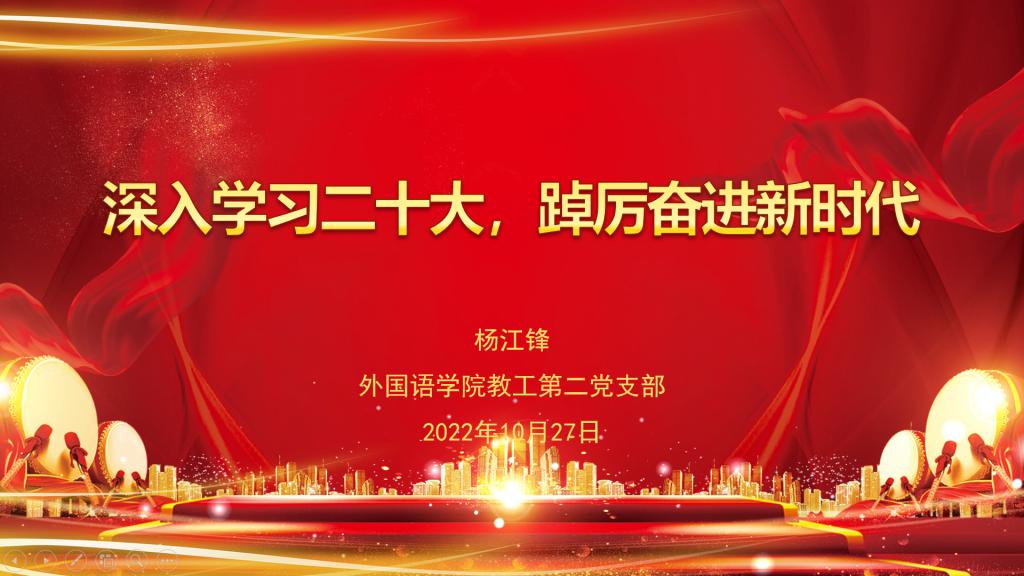为深入学习党的二十大报告,深刻理解二十大精神,pp电子官方网站党总支10月27日组织三个党支部共同上党课《深入学习二十大,踔厉奋进新时代》,由pp电子官方网站教工第二党支部书记杨江锋主讲。