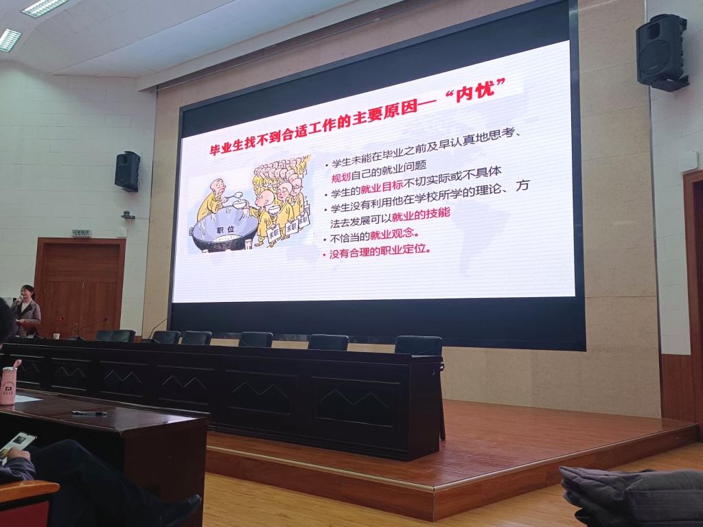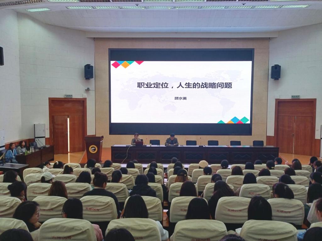 11月16日下午,pp电子官方网站特邀BCC国际生涯教练,高考志愿高级规划师(AUP),高校生涯课程导师,省级创业导师,国家一级职业指导师顾水英老师在2号报告厅作了题为“职业定位,人生的战略问题”的职业生涯规划辅导报告,外语学院领导班子部分成员、辅导员、班主任及2018、2019级本科生现场聆听此次报告。