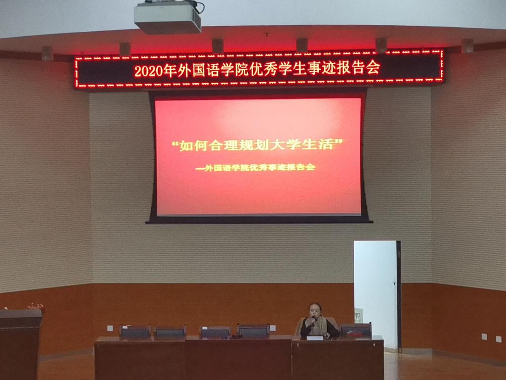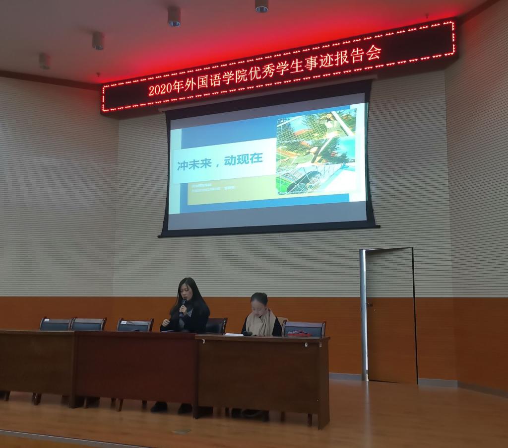 报告会期间,7位同学分别介绍并展示了自己大学生活的片段与经历,分享了学习技巧及心得。参军入伍两年的胡锦花学姐向同学们展示了她在军营中的生活与经历,告诫大一的新同学们要不断超越自己、挑战自己,行动是成功的一半;国馨予学姐分享了她口语练习的技巧及学习心得,希望同学们能认真思考,珍惜大学时光,做好规划;陆丹妮学姐也分享了自己的学习技巧,希望学弟学妹们拓宽眼界,勇敢做自己想做的事;王悦学姐建议同学们找到适合自己的学习方法,同时也分享了自己大学生活中的经验和教训;肖彩霞学姐认为20级的同学们应该积极参加活动,要锻炼自信、乐观、自强、奋进的精神,强调同学们应该学会感恩、热爱生活;焦裕洁学姐展示了自己大学生活的片段与经历,就如何在大学里“乘风破浪”做了演讲:一、重新认识自己;二、实现自我价值;三、保持拥有有趣的灵魂;管雅雯学姐以“冲未来,动现在”为主题,从自我认知、定位目标、生活感想3个方面,就“我是什么样的人”、“我想成为什么样的人”、“我怎样成为我想成为的那个人”3个层次告诫同学们要加强自我认知,合理规划生活,努力奋斗开发潜能,同时也要遵循自己的兴趣愿望。