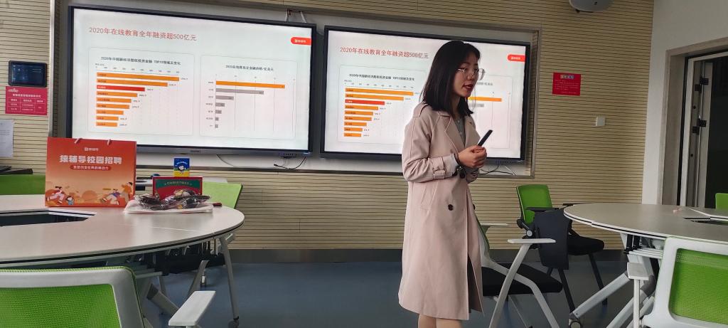 宣讲开始,企业负责人首先就公司概况为同学们做了详细讲解:猿辅导在线教育成立于2012年,是全球教育科技领域估值最高的独角兽公司,也是目前国内网课用户规模最大的在线教育集团。公司旗下有猿辅导、斑马AI课、小猿搜题、校园口算、猿题库等多款在线教育产品。目前全国员工规模超50000人,总部位于北京,同时在西安、武汉、郑州、长沙等各大城市设分公司。随后负责人为同学们介绍了招聘岗位、薪资待遇以及晋升机制。包括一年两次的晋升评审,只要有足够的能力,新入职的老师们都能通过竞聘走向更高的岗位。