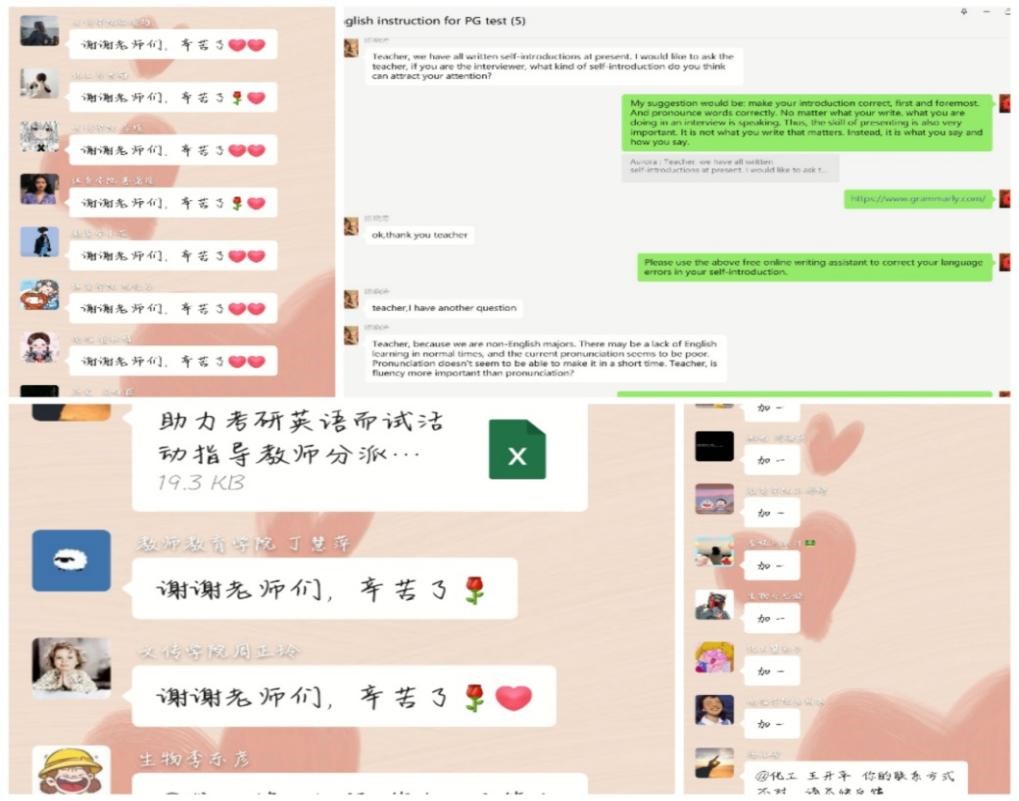 活动于3月14日正式启动。通过创建“助力考研英语面试服务群”微信群,邀请pp电子考研上线进入复试环节的非英语专业学生入群,开展初步摸底工作,掌握所有需要帮助的学生的确切信息,以便能更精准有效地实施培训和辅导。同时,还专门安排人员在群里耐心为学生解疑答惑。活动得到了全校不同专业300余名学生的积极响应。