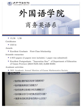 工业大学就读的博士研究生和两名来自于20级商务英语专业的优秀学子,分别围绕“考研经验”、“大学学习”和“大学生活”,向同学们分享了自己的宝贵经验,并对新生提出的问题