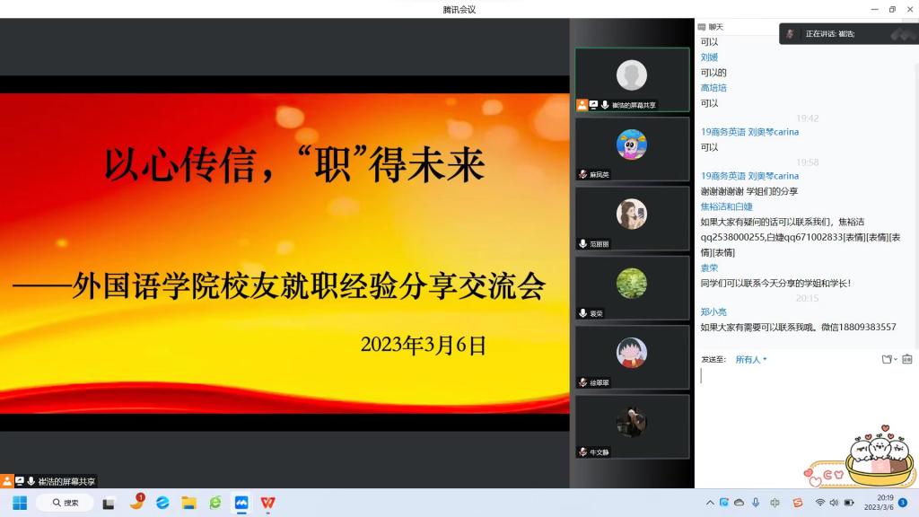 根据调研,当下毕业生求职活动中存在对自己的职业规划没有十分明确的目标、对职场的真实状况缺乏了解、对求职过程存有疑惑及近年来不容乐观的就业形式等问题。为了解决这些困扰毕业生的问题,外语学院组织开展了本次就职经验分享交流活动。pp电子官方网站党总支副书记、就业工作领导小组副组长袁荣出席并主持了交流活动,pp电子官方网站2023届毕业班班主任、辅导员,2023届毕业生及2024届学生参加了交流活动。本次活动以腾讯会议的形式开展。