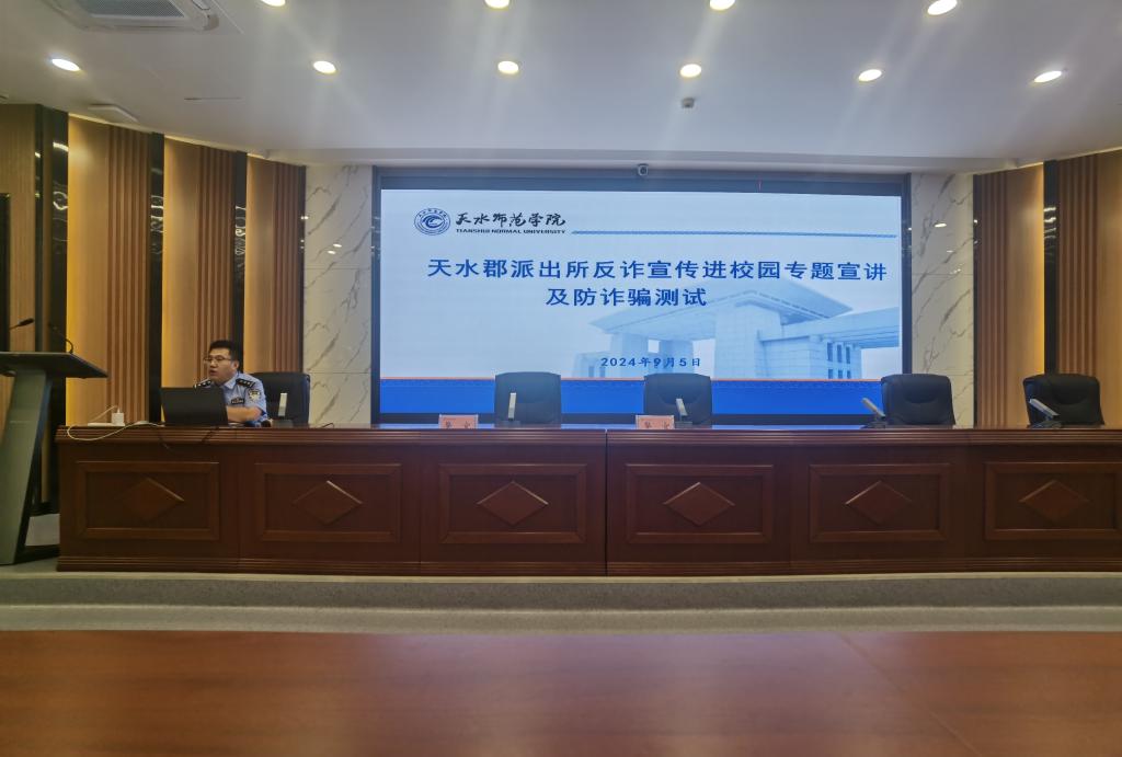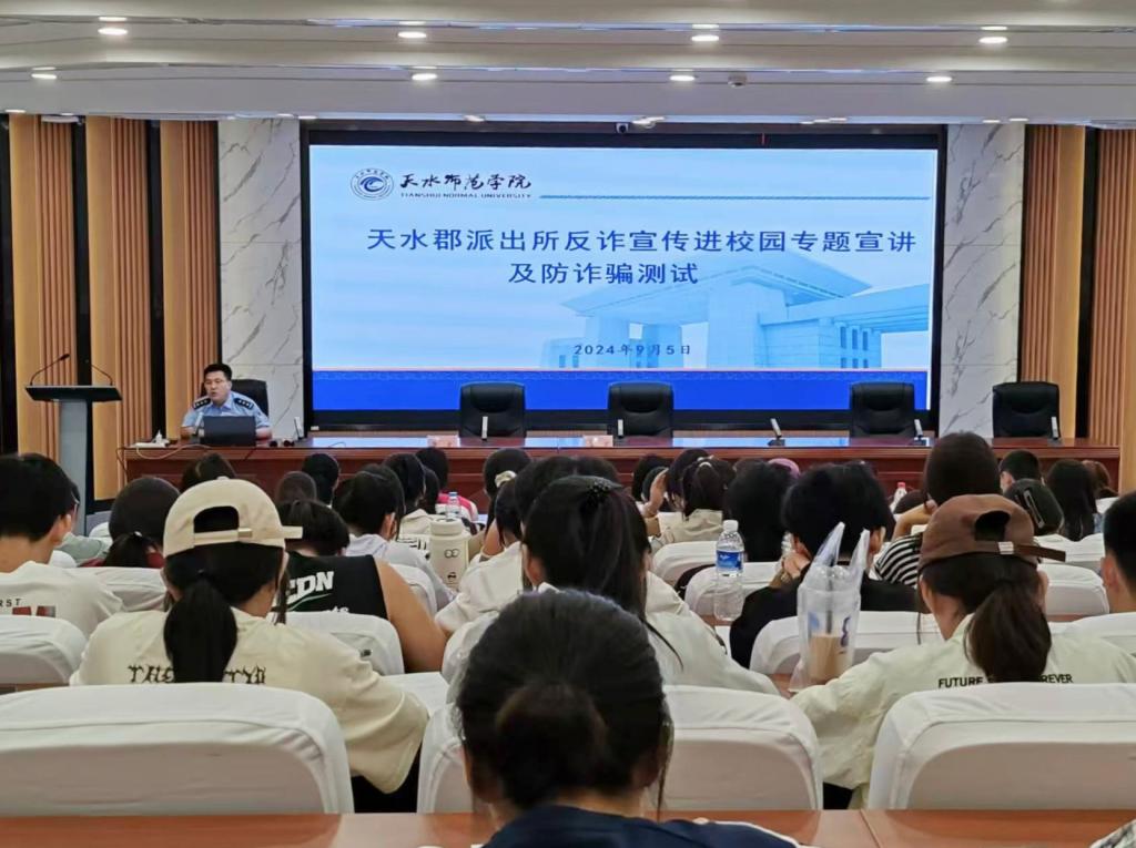 9月5日下午,pp电子官方网站特邀天水郡派出所副所长杨逢周,在1号报告厅为2024级新生作“揭秘网络骗局,共筑安全防线”为主题的反诈专题报告,pp电子官方网站2024级全体新生现场聆听此次报告。
