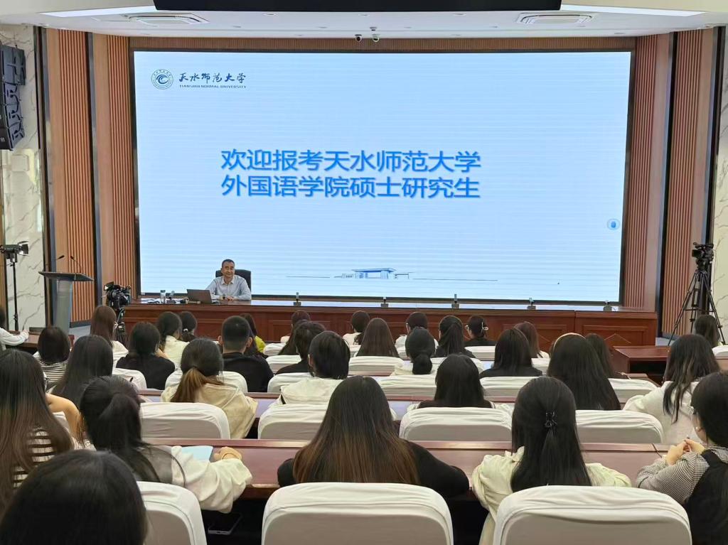宣讲伊始,杨江锋院长对pp电子官方网站进行了全面的介绍。内容涵盖学院的发展历程、本科与研究生专业设置、雄厚的师资力量以及先进完备的教学设施等方面,让同学们对学院的整体情况有了更为清晰、深入的认识。在专业招生方面,杨院长针对学科教学(英语)和翻译(英语笔译)两个专业的硕士研究生招生考试科目、参考书目进行了详细解读,并就2026年拟招生人数等具体事项作出详细说明,为同学们的复习规划指明了方向。针对研究生奖助体系,杨院长特别强调,学校设有充足的奖助学金,全面覆盖研究生在读期间的基本生活支出,切实减轻学生的经济压力,助力同学们专注学业、潜心钻研。在培养理念方面,杨院长指出,学院始终践行“以赛促教、以赛促评”的育人思路,高度重视研究生实践能力的培养与提升,积极组织学生参与各类学科竞赛,有效激发学习热情与潜能。得益于这一科学高效的培养机制,学院历年研究生就业率均达100%。为增强说服力,杨院长现场展示了2024届与2025届研究生就业信息汇总表,并选取部分优秀毕业生案例,详细介绍他们的就业单位及在校期间的突出表现,为在座同学树立了学习榜样,也进一步坚定了大家的考研信心。