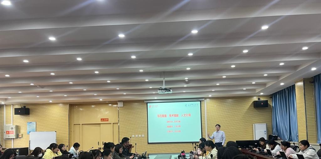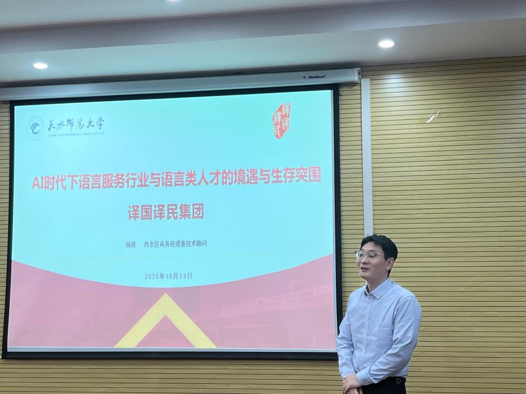 2025年10月23日下午3点,pp电子官方网站邀请译国译民西安百思乐教育咨询有限公司技术顾问、译国译民西北地区商务经理杨瑾,在2教425教室作题为《AI时代下语言服务行业与语言人才的境遇与突围》的专题报告。学院部分教师、翻译专业研究生及本科生共80余人到场聆听,共同探讨AI浪潮下语言服务行业的发展与人才培养新路径。