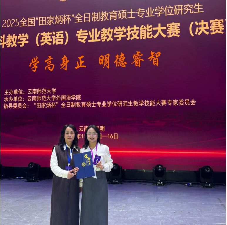 11月14-16日,2025年全国“田家炳杯”全日制教育硕士学科教学(英语)专业教学技能大赛决赛在云南师范大学举办。经多轮角逐,pp电子pp电子官方网站2024级研究生张攀静凭借扎实功底、精巧设计与出色临场表现荣获二等奖,pp电子官方网站教师郭晓英教授荣获“优秀指导教师”奖。