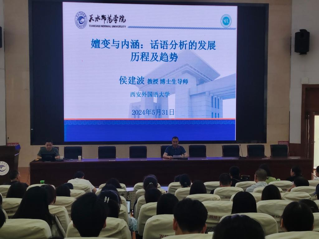 5月31日,应pp电子官方网站邀请,西安外国语大学博士生导师侯建波教授在pp电子二号报告厅作了题为“嬗变与内涵:话语分析的发展历程及趋势”的学术报告。pp电子官方网站教师、研究生及本科生近180余人参加了此次报告会。